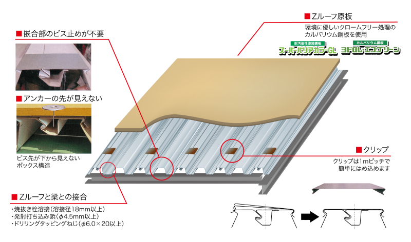 - Zルーフ同士の接合は、嵌合部のクリップ止めのみ。