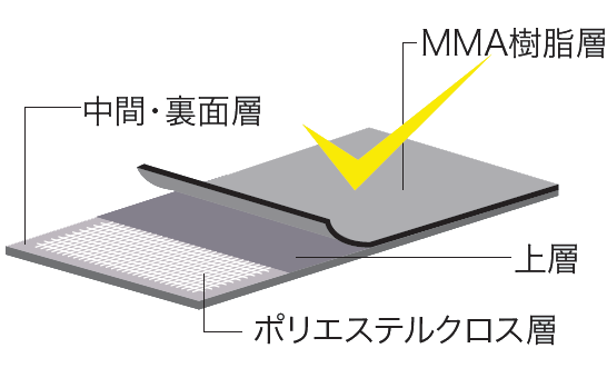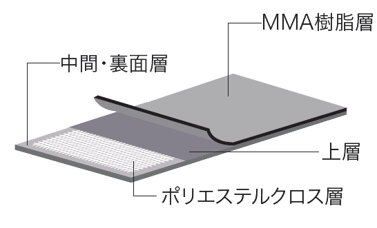 紫外線を遮断するMMA樹脂層を積層しているので、長期に変退色が少なく、また耐熱性能に優れているので、熱劣化の影響を受けやすい金属下地の工法に適しています。 ポリエステル樹脂製の補強クロスが積層されているため、優れた引張・引裂強度を実現。特に柔軟性に優れ、繰り返し疲労に対して優れた性能を示します。色 | ライトグレー |
